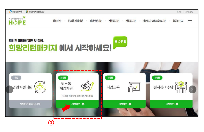 희망리턴 패키지 홈페이지 접속하여 회원가입 및 로그인을 한 후 원스톱 폐업지원 신청하기를 클릭합니다.