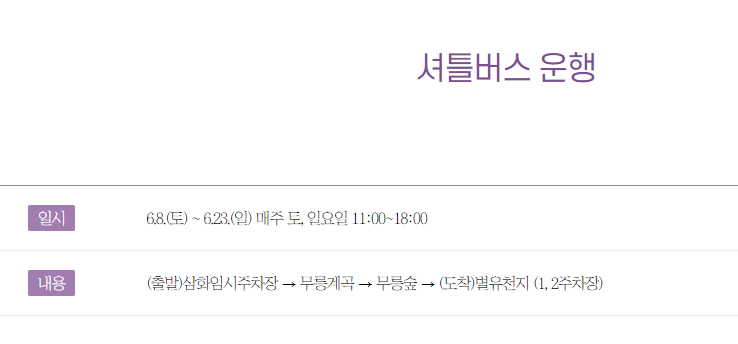 - 셔틀버스 운행 : 6월 8일~23일 매주 토, 일요일 11:00 ~ 18:00
