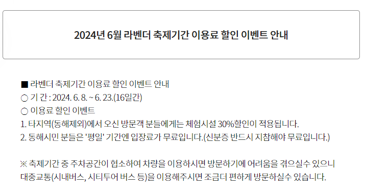 또한 동해 무릉별유천지 에서는 라벤더 축제기간 이용료를 할인해주는 이벤트도 진행하고 있습니다. 동해 제외한 타지역에서 오신 방문객들에게 체험시설 30% 할인이 주어진다고 합니다. 동해시민들은 '평일' 방문시 입장료가 무료라고 합니다. 입장료 무료 혜택은 신분증 지참이 필수입니다.