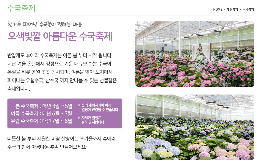 제주는 수국을 즐길 수 있는 아름다운 곳들이 많아 수국 축제도 아름답기로 유명합니다. 휴애리 여름 수국축제는 정성스럽게 키운 다양한 수국을 온실, 수국정원, 수국오름 등 공원 곳곳에서 감상할 수 있습니다. 특별히 온실에서 다양한 수국을 만나 볼 수 있으며 공원 첫 입구부터 나오는 출구까지 전체가 수국으로 덮혀 있어 아름다운 풍광으로 유명합니다.